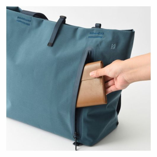 内側のポケットには濡れたままの折りたたみ傘やペットボトルなどを収納できる防水ポケットやファスナーポケットを設置。