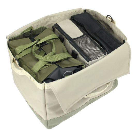 収納や運搬に便利なソフトタイプのコンテナ。キャンプ、カートラベルや近隣のレジャーに最適です。普段は買い物バックとしてもお使いいただけます。こちらのシリーズは3サイズご用意しております。アウターコンテナにはMサイズが2つ、MサイズにはSサイズが2つ、それぞれ収納可能。