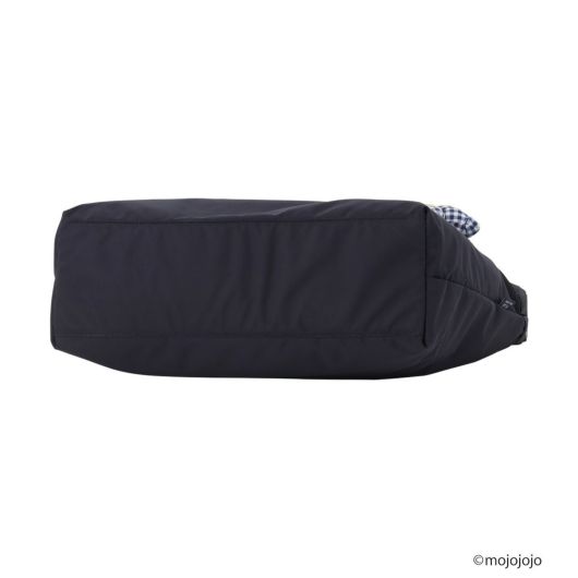mojojojoコラボのオリジナルチャーム付きニュースペーパーバッグ。ブルーチェックのボディに、イエローのボウタイを付けたBOYNAカラーのくまちゃんチャームを特別に制作しました。ハート型のお鼻もさりげないポイントです。