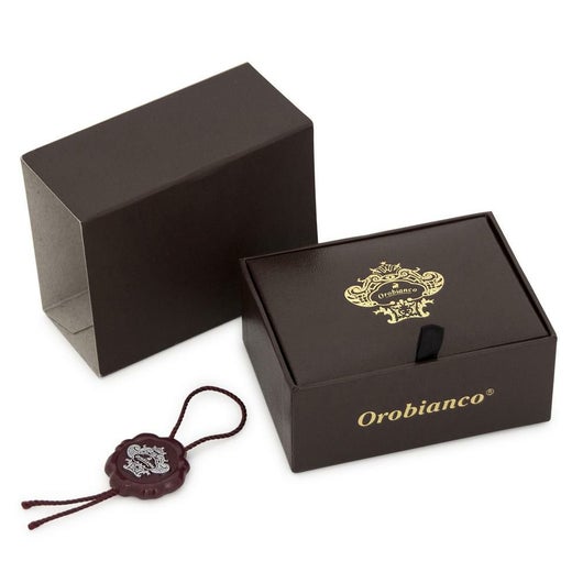 オロビアンコとは、イタリア語で“白金”、“貴重なるもの”という意味。ジャコモ氏がチベットを旅している際、現地人がカシミヤを“ホワイトゴールドと呼び、敬意を持って取り扱っている事に感銘し、「ORO(金)」「BIANCO(白)」=『OROBIANCO』と命名。ロゴの中央にいる動物は、このカシミヤヤギがモチーフになっている。