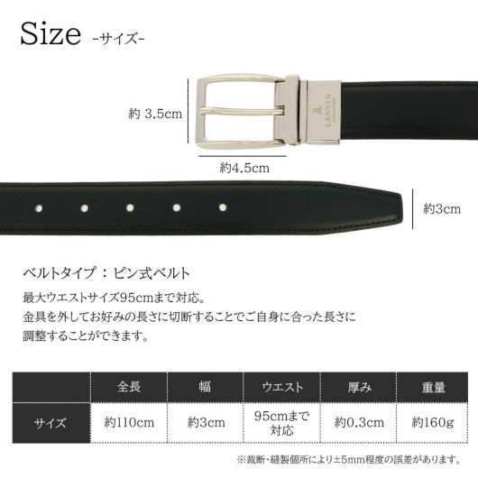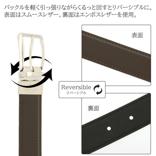 表面はスムースレザー、裏面はエンボスレザーを使用したリバーシブルタイプのベルトです。それぞれ、ブラックスムースレザー×チョコエンボスレザー、チョコスムースレザー×ブラックエンボスレザーのリバーシブル仕様になっています。シャープなデザインのバックルに、ランバンコレクションのロゴをレザー彫りで表現しました。幅広いシーンにマッチするコーディネート力抜群のアイテムです。