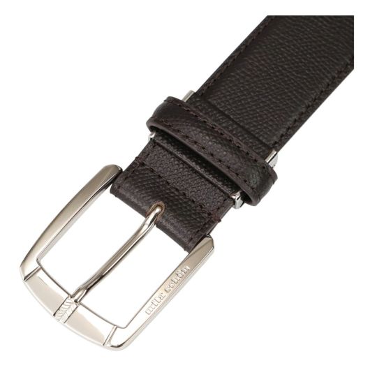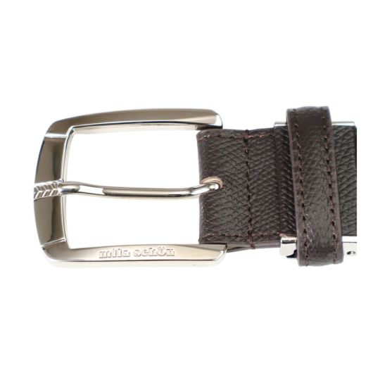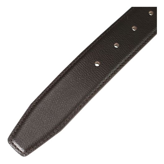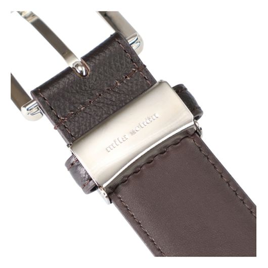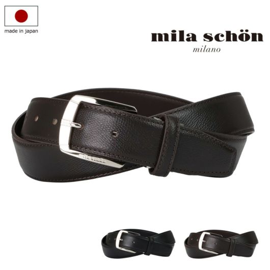 エンボスレザーを使用しています。バックルの先端部分には、ミラ・ショーンの象徴の柄でもあるシェブロン柄をさりげなく刻印しています。3.5cm幅のやや太めなベルトなので、休日のジャケットスタイルからビジネスシーンまで、幅広いスタイルにマッチします。ベルトをお好みの長さに調整できるよう、バックルには中間フリー金具を使用しました。金具を外してお好みの長さに切断することでご自身にあった長さに調整することができます。贈り物としても最適なアイテムです。