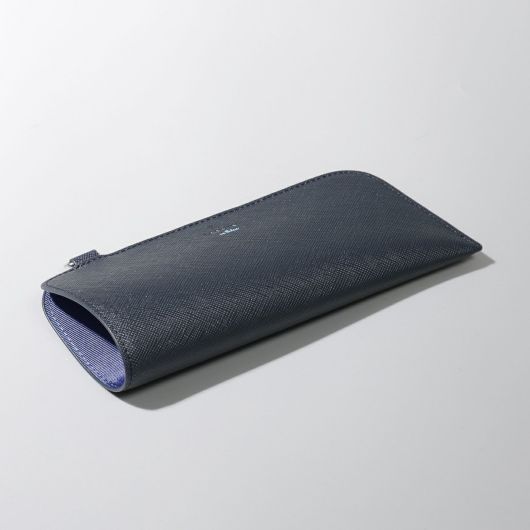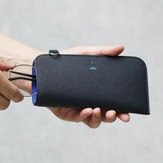 当社限定のオリジナルシリーズにグラスケースがラインナップ。上質な牛革を使用し、表面は細かい型押しを施したサフィアーノ調の高級感のある生地に。内装ポケット部分は少し明るめのネイビー生地をコンビカラーとして採用する事でLANVIN en Bleuらしい遊び心を演出しています。
