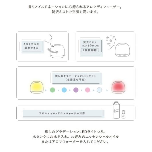 香りとイルミネーションに心癒されるアロマディフューザー。贅沢ミストで空気も潤います。ミスト量は最大60ml/h(2段階調節)。ミスト方向も調節できます。癒しのグラデーションLEDライトつき。水タンクにお水を入れ、お好みのエッセンシャルオイルまたはアロマウォーターを入れてください。