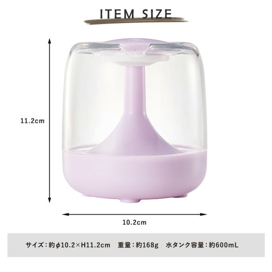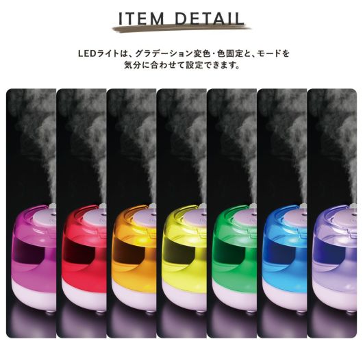 USB接続でパソコンからも給電できるから、オフィスワークや在宅ワーク時に便利♪デスクに置くのにちょうど良いサイズ感、コロンとしたかわいらしいフォルム。LEDライトはグラデーション変色、色固定とモードが選べるのもうれしいポイント。