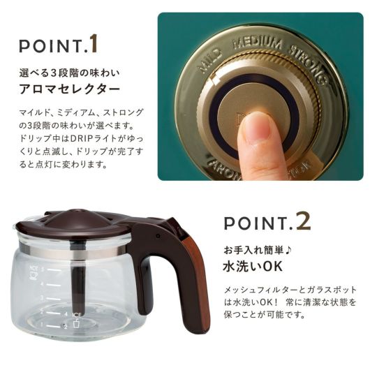 「間欠抽出」でハンドドリップのように、コーヒー粉をじっくり蒸らしながら淹れられるコーヒーメーカー。ノズルから抽出されたコーヒーがポット内のコーヒーを対流させることで、均一な濃さのコーヒーができあがります。1度に5杯分のコーヒーが淹れることが可能で、保温プレートにより抽出したコーヒーの保温が可能です。メッシュフィルターとガラスポットは水洗いOK。