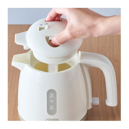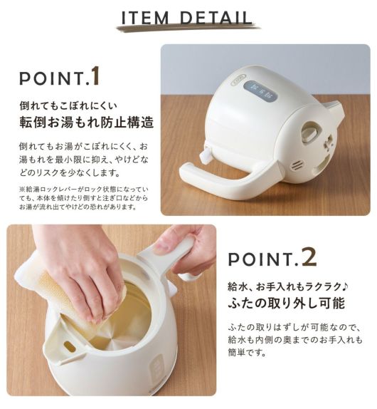 水を入れて電源を入れるだけの簡単操作。シンプルな使いやすさで、普段使いに最適。倒れてもお湯がこぼれにくい「転倒湯もれ防止機能」と「空焚き自動 OFF 機能」が付いた安全設計。