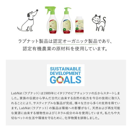 LabNat(ラプナット):1989年にイタリアのピアチェンツァの丘からスタートしました。家族の伝統から学んだ古代に由来する自然の処方を今日の技術に取り入れることにより、サスティナブルな製品が完成、様々な方から多くの支持を得ています。ラプナットの製品は環境への影響がなく、天然および再生可能な資源に由来する植物性およびミネラル成分のみを使用しています。私たちや大切なペットの生活や環境を守るために、化学物質を排除しました。