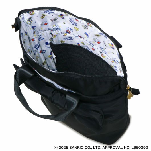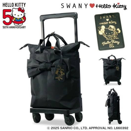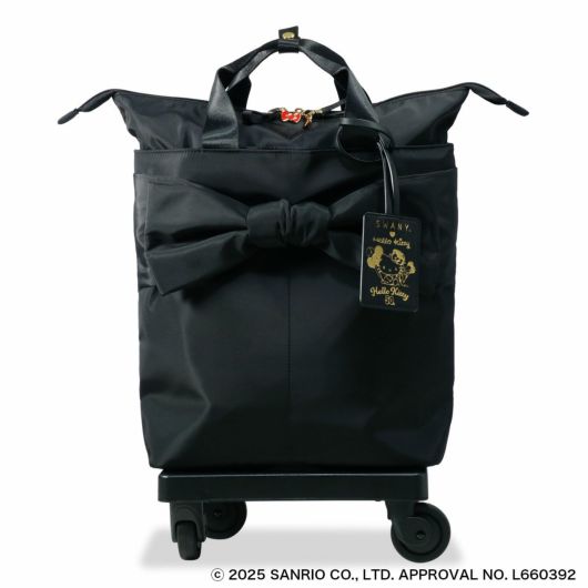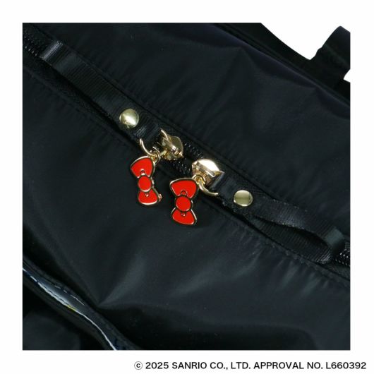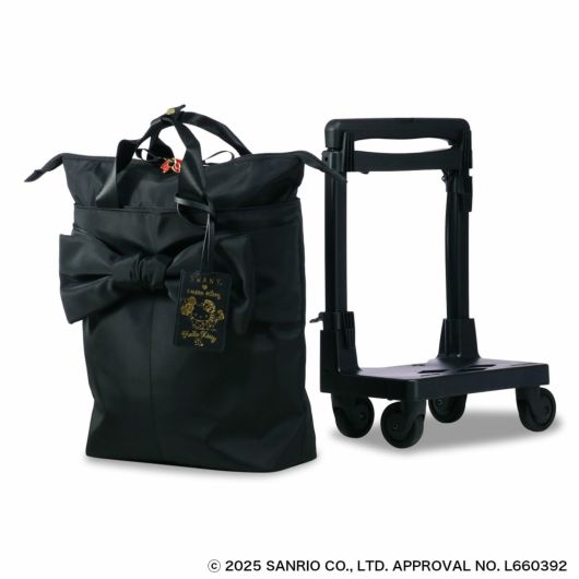 大き目のリボンがチャーミングで可愛らしさと実用性を兼ね備えたシリーズです。シックな黒基調ながら、ファスナープラーにはリボンチャームをあしらい、バッグ内装は総柄プリントを使用しています。キャリーバッグはミドルサイズのトートバッグ型で日常的に長く使用できるバッグフォルムです。