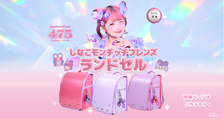 しなこモンチッチフレンズの刺繍や、お菓子の国をテーマにしたオリジナルスイーツの刺繍、きらりと光るリボン鋲、取り外し可能なリボンチャーム、ハート型の前ポケット。かぶせを開くとスペシャルコラボアートを使ったモンチッチフレンズの総柄が目を惹きます。オリジナル時間割表&ネームカードつき!
