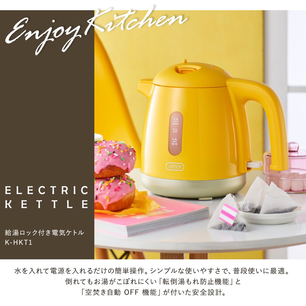 他の画像を見る Toffy トフィー 給湯ロック付き電気ケトル トフィー 電気ケトル 0.8L ハッピーコレクション K-HKT1 Toffy|給湯ロック付き電気ケトル カラフル 800ml 電気ポット コンパクト 一人暮らし 家電 調理器具 シンプル おしゃれ かわいい ラドンナ 1年保証 販売価格 ¥ 5,500 税込 詳細を見る お気に入りに登録する