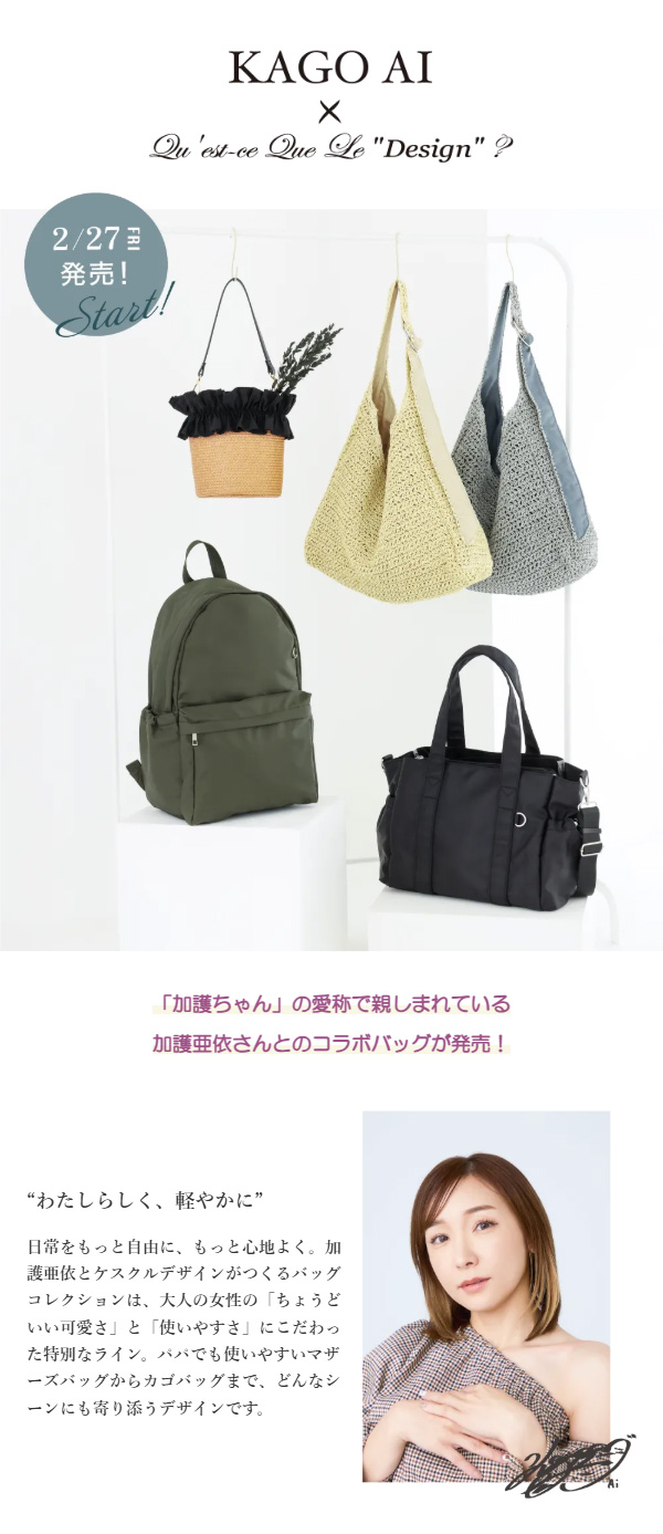 タレントとして、母として活躍する加護亜依さんと、当社オリジナルブランド「ケスクルデザイン」とのコラボレーションバッグが登場。