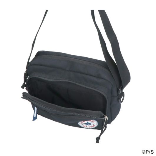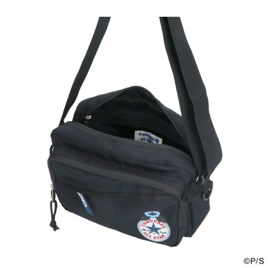 コンバースのアンクルパッチロゴから覗くスンスンが可愛いスペシャルアートの刺繍が印象的なデザインのミニショルダーバッグです。本体背面にはコンバースオールスターに入って手を振るスンスンのイラスト織りネーム、本体直通のサイドファスナーに表裏でそれぞれのロゴが入ったファスナー引手テープ、本体内側のコラボアートプリントネームなど、普段使いしやすいシンプルで控えめなデザインながら、特別コラボアートが随所に施された特別感ある仕上がりになっています。本体生地は絶妙な光沢感の軽くて丈夫なポリエステルキャンバス素材を採用。コンパクトで使いやすいスクエア型のショルダーバッグは、しっかりとマチ幅があり見た目以上の収納力で500mlのペットボトルもすっぽり収納することが出来ます。背面にはスマホを収納するのに便利なスマホスリーブ付き。本体正面には二層のファスナーポケットと、本体内側に内容物がわかりやすいメッシュポケットがあるので、細かいものを整理して収納することが出来ます。コンパクトながら収納力があり、男女兼用でお使いいただけるちょうど良いサイズ感で、普段のちょっとしたお出かけから、レジャーやトラベルシーンまで様々なシチュエーションでご使用頂けます。