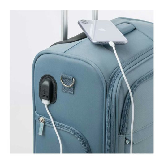 脱着可能なショルダーベルト付きスーツケース。他に荷物を持っての階段や舗装されていない道路で重宝します。キャスターも脱着可能で家庭での保管時キャスターの汚れを持ち込むストレスから解放されます。USBポート付きで、別売りのモバイルバッテリーを接続することでスマホ等の充電ができます。メインファスナーはこじ開けに強い防犯ファスナーを使用しています。