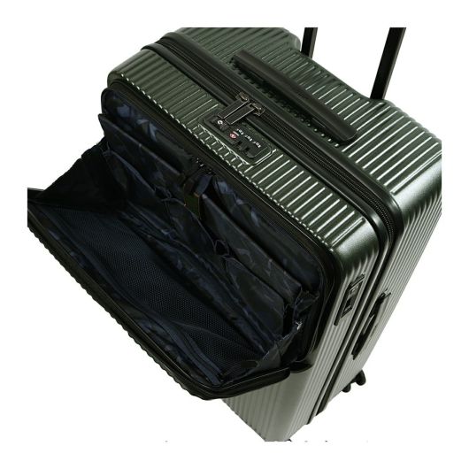 多機能かつスタイリッシュなラージサイズケース。トップオープンポケットは移動中に素早く荷物の出し入れが可能。トップオープンポケットの奥側に、フレキシブル収納ポケットがあり、大きい荷物も移動時に収納・取り出しが可能。プライベートやビジネス、また数泊の家族旅行にも使える機能的なスーツケースです。