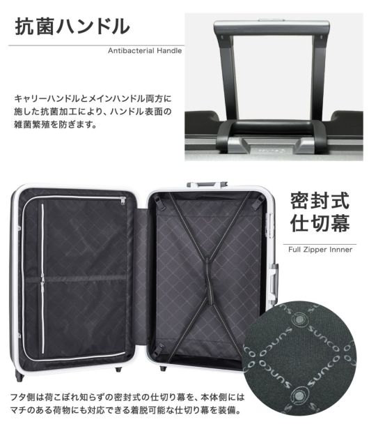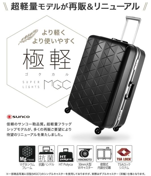 信頼のサンコー鞄品質。超軽量フラッグシップモデル「SUPER LIGHTS MGC|極軽」が、多くの再販ご要望により待望のリニューアル。キャスターがダブルホイール仕様になり、軽さはほとんど変わらず、より安定性が増しました。