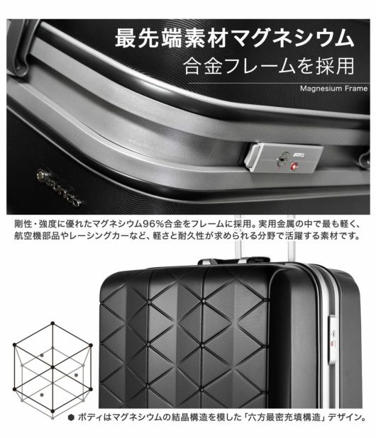 100年を超える旅行鞄メーカーとしての誇りは部材メーカーとの連携による数々の機能性パーツに現れています。マグネシウムフレーム、軽量静音キャスター、抗菌ハンドル、浮かし貼り内装などを絶妙に組み合わせ、すべての旅行者に快適をお届けするための最高の完成度に仕上がっています。