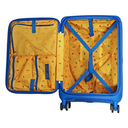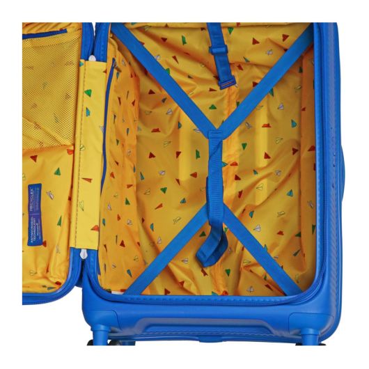 回収したPETボトルを100%原料とする生地がつかわれた内装には、荷崩れを防止するクロスストラップと、小物収納用のポケットが付属しています。