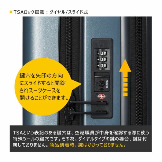 備考 |※このスーツケースのTSAロックはダイヤルコンビネーションロックです。鍵穴は、TS職員が緊急の際に解錠して検査を行うためのものであり、差し込み式のキーは付属しておりません。