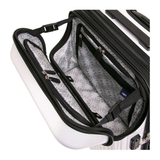 使いやすさ抜群のトップオープンキャリー。機能性とデザイン性の両方を兼ね備えたスーツケースになりました。シンプルなデザイン、ベーシックなカラー展開なので男女問わずお使い頂けます。トップオープンポケットの中仕切りはまとめてボタンで留めることができてポケットを広くすく事ができるので用途に合わせてお好みの使用方法が可能。内装やファスナー引手など細部にまで「HeM」をあしらったデザイン。