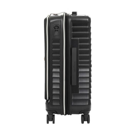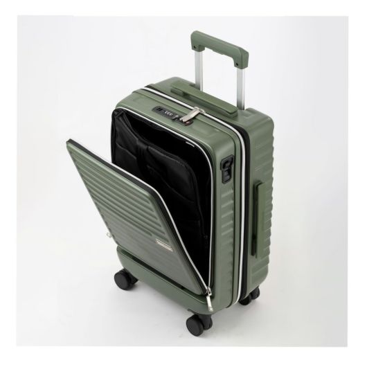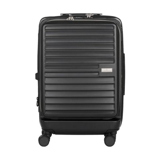 拡張ファスナーを操作することによってマチ幅が7cmアップ。拡張部分の上下には特許技術を用いた型崩れを防止する特殊プレートを内蔵している為、荷物の出し入れ時にスーツケースを横にしても形状が崩れません。本体側面に付いているスイッチを下におろすと、キャスターをストップすることが可能です。狭い場所でも使いやすい縦開きフロントオープン仕様。ノートPC収納スペースを装備しています。従来のキャリーバーより、多くの段階でストップできる段階調整キャリーバーを採用。自分に合った高さで快適な姿勢を保つことが可能です。