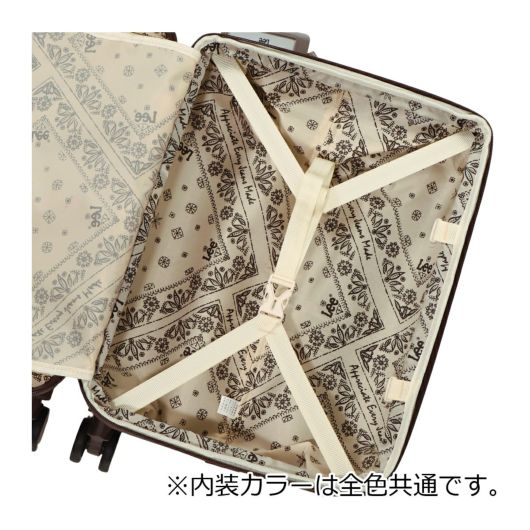 本体にLeeブランドのイメージでもあるデニム調柄を使い、内装生地にもLeeロゴ入りバンダナ柄を使用しています。拡張ファスナーの引手にオーバーオール型の引手を使用しおしゃれに演出しています。