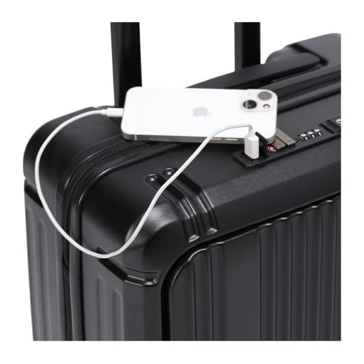 本体側には待ち時間等にスマートフォンなどのお手持ちのモバイル機器を充電できるUSBポートを2口装備。モバイルバッテリーは内部のポケットに収納可能。※モバイルバッテリー・充電ケーブルは本製品には付属しておりません。