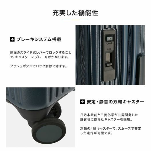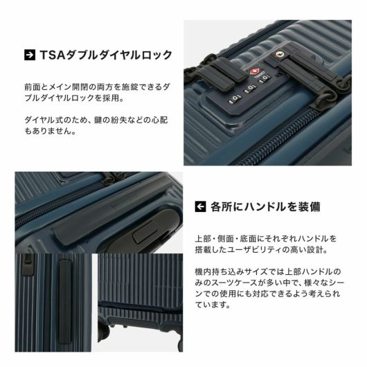 フロントポケット、TSAダブルダイヤルロック、ブレーキシステム、消音双輪キャスター、サイドハンドル、ボトムハンドルと多機能でありながらスタイリッシュなコインロッカーサイズケースです。3ルーム収納方式で、ビジネスでもプライベートでも用途に合わせた収納が可能。また、フロントポケットはワイドオープン仕様で、省スペースで収納も可能です。