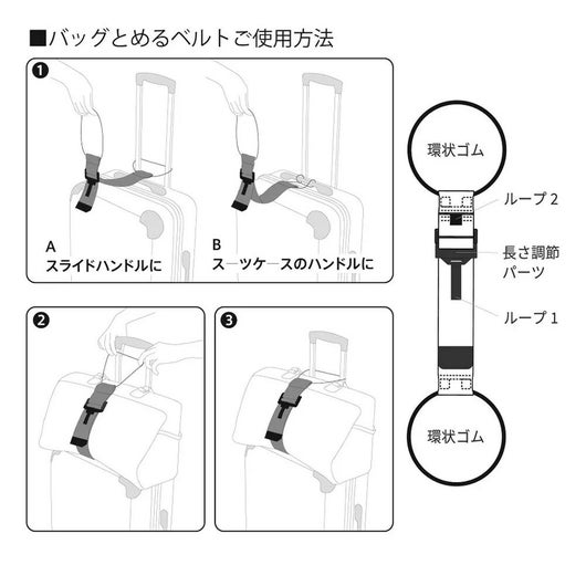 旅行や出張の際に荷物が増えてしまった場合や、サブバッグの持ち運びが便利になる一品です。幅広ベルトと強力ゴムでスーツケースの上にガッチリ固定できます。ベルトをスーツケースのハンドルに通してバッグを留めれば簡単に固定できます。カラビナやキーホルダーが付けられるループ付きです。
