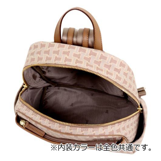 ブランドロゴを総柄で落とし込んだキャッチーなシリーズ“フェリア”。フェミニンスタイルにもよく似合うリュックサックです。バイカラーのレザーパネル部分がアクセントとなって、全体を上品に引き締めています。お買い物やデート、普段使いのカジュアルシーンはもちろん、ビジネスシーンでも活躍してくれる、使い勝手の良さが自慢の1品。