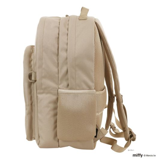 ノートPCやタブレットを入れるクッションポケットや500mlペットボトルを入れられるサイドポケットなど機能性抜群。耐久性に優れたコーデュラファブリックを採用し、ファスナーはYKK社が鞄向けに開発した織り込みファスナーで従来品よりも優れた耐摩耗性が特徴。リュック背面はスーツケースに載せてもズレ落ちない移動時も便利なキャリーオン機能付き。