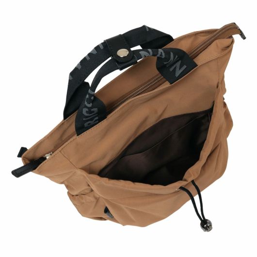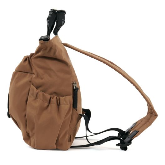 本体はB5サイズまで収納可能な適度な大きさのリュックサック。前面のガバっと開く巾着ポケットの中はさらに細かく小分けにできるポケットが付いています。サイドにはペットボトルが入るゴム入りポケット、背中側にはコインケースや二つ折り財布などを収納でき、防犯にも役立つファスナーポケットがついています。