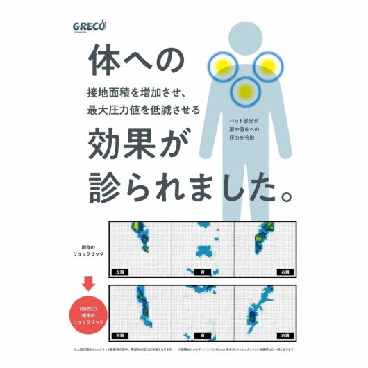 ショルダーパット内部には「GRECO」と呼ばれるクッション材を使用しており、肩にかかる耐荷重を軽減してくれる効果があります。