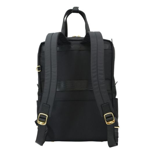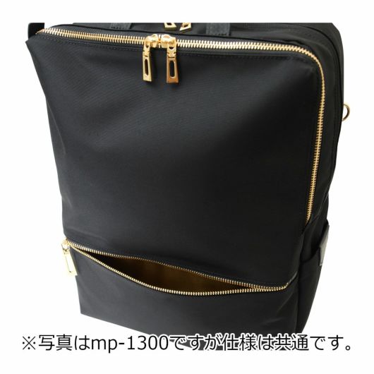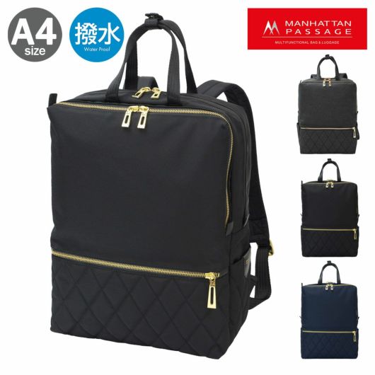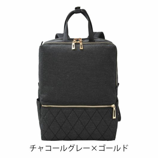 A4対応の軽量リュック。カジュアルでもビジネスでもどんなシーンにも合わせやすいシンプルなデザイン。フェイスのキルティングが都会的な雰囲気を演出します。裏地とファスナーのゴールドがアクセントになっています。