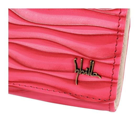 ウェーブの型押しが印象的なシリーズ。型押しをした後に、陰影をつけるために染料で斜め吹きをしていて、より立体的な柄が浮かび上がってきます。二つ折り財布ながら札入れもついておりコンパクトかつしっかり収納できます。シンプルだけど他にはない、オシャレなシリーズです。