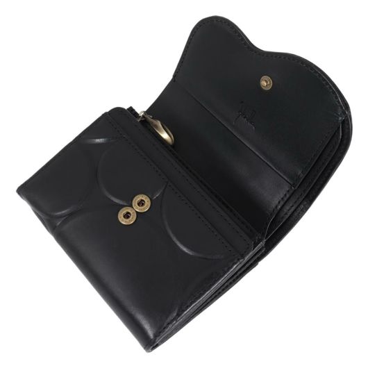 牛革に大小様々なサイズの円を大胆に型押しし、ぷっくりとした凹凸が楽しめるシリーズです。型押しに合わせたスカラップ風のデザインカットは個性的で目を引くこと間違いなしです。二つ折り財布でコンパクトに使いまわせます。新たにデザインしたロゴ入りのオリジナル引き手もお財布の特別感をより一層引き立てます。