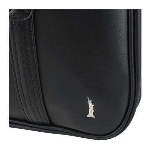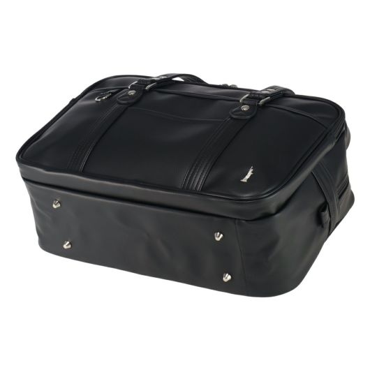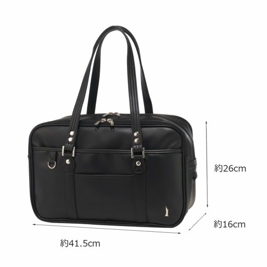 ダブルファスナーのスクールバッグ。合皮の表面はシボ感があり多少の傷も目立ちにくく高級感があります。女神刺繍は〈ヴィーナス〉の証のシルバー色、裏地はブランドネームのプリント入り。底鋲もシルバーです。A4サイズも収納でき、収納力抜群。折りたたみも可能な底板が内蔵されているので、用途によって立てたり敷いたり出来ます。