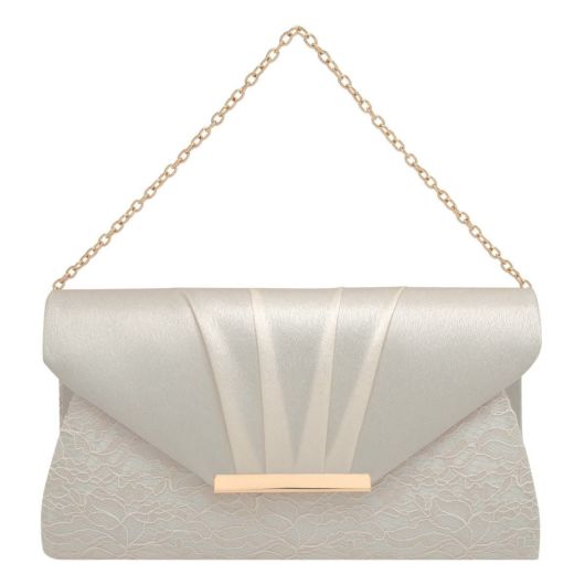 本体部分にレース生地、フラップ部分にサテンを用いたコンビネーションが特徴的なデザインのパーティーバッグです。クラッチバッグとして持っていただけ、さらには長短2種類のチェーンストラップが付いており肩掛けワンショルダー、斜め掛けと2通りの持ち方も楽しんでいただけます。