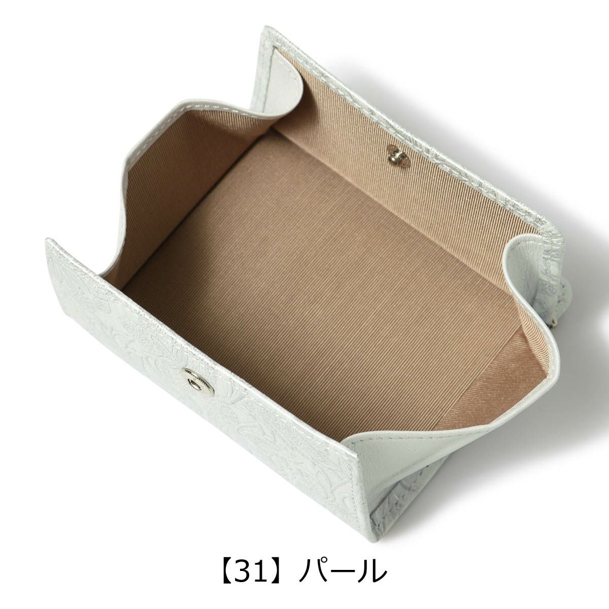 イタリアで丁寧に作られた型押し革。繊細でパールの輝きがある花柄は持つ人の女性らしさを強調させます。