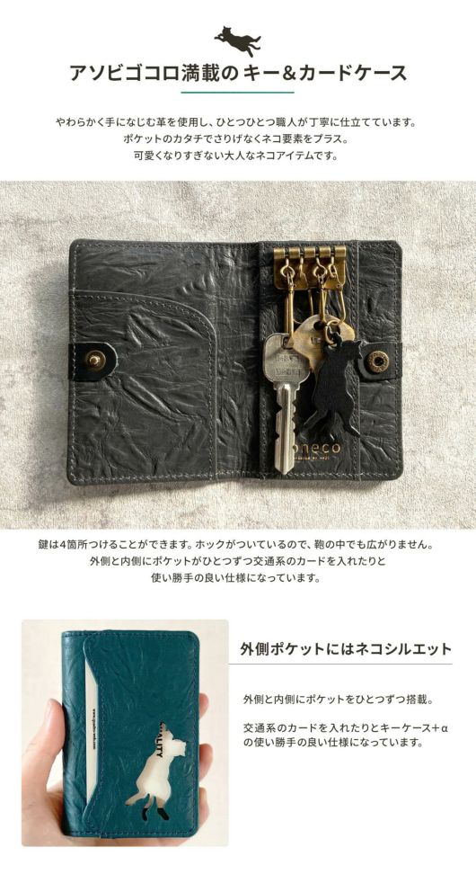 やわらかく手になじむ革を使用し、ひとつひとつ職人が丁寧に仕立てています。ポケットのカタチでさりげなくネコ要素をプラス。可愛くなりすぎない大人なネコアイテムです。鍵は4箇所つけることができます。ホックがついているので、鞄の中でも広がりません。外側と内側にポケットがひとつずつ交通系のカードを入れたりと使い勝手の良い仕様になっています。