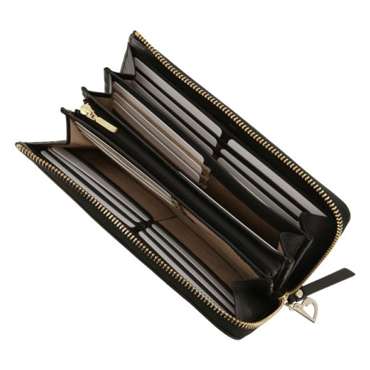 小さなカッティングハートをランダムに飛ばしたシンプルなデザインながらも遊び心があるシリーズです。ハート型にくり抜いたところに別の色のハートをパズルのように埋め込んでいます。埋め込んでいるのでさわり心地がフラットで、革も滑らかなのが長所です。グレーとブルーは内装とカラーコンビになっています。