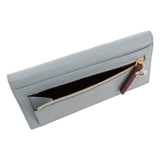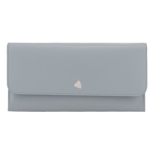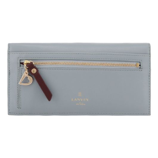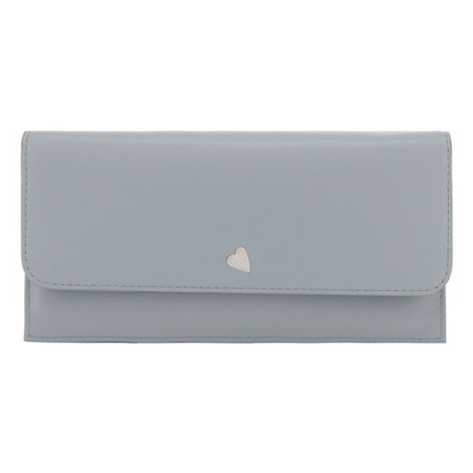 小さなカッティングハートをランダムに飛ばしたシンプルなデザインながらも遊び心があるシリーズです。ハート型にくり抜いたところに別の色のハートをパズルのように埋め込んでいます。埋め込んでいるのでさわり心地がフラットで、革も滑らかなのが長所です。グレーとブルーは内装とカラーコンビになっています。