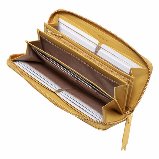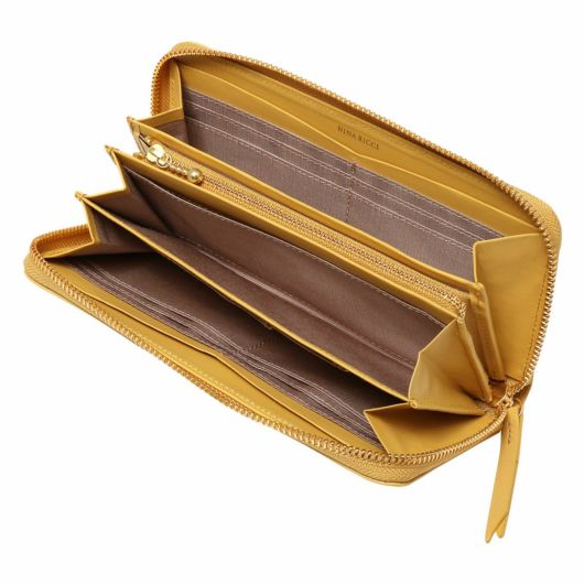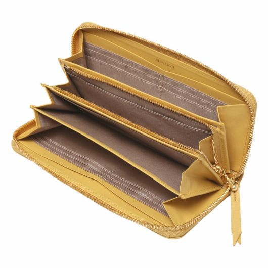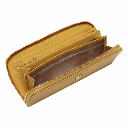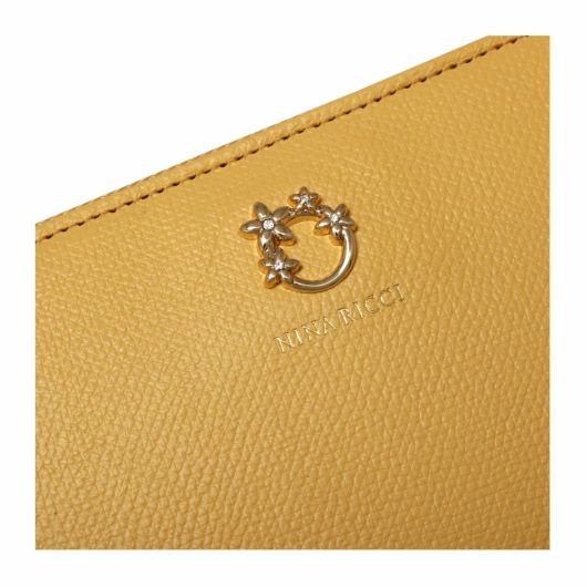 NINA RICCIコレクションで使用されている花柄をモチーフにしたリング状のブローチがエレガントでありながら大人可愛い印象のお財布シリーズ。表素材には傷が目立ちにくい型押しの牛革を、内装には同色系のスムースな牛革を使用しています。
