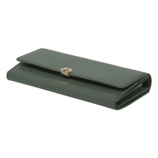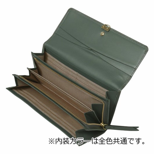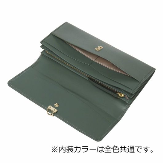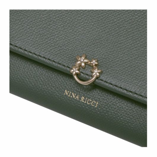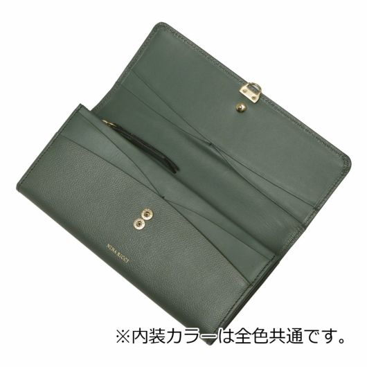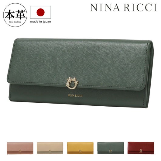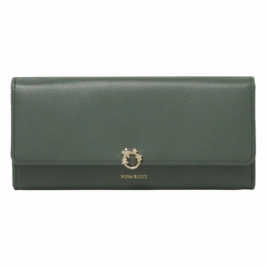 NINA RICCIコレクションで使用されている花柄をモチーフにしたリング状のブローチがエレガントでありながら大人可愛い印象のお財布シリーズ。表素材には傷が目立ちにくい型押しの牛革を、内装には同色系のスムースな牛革を使用しています。
