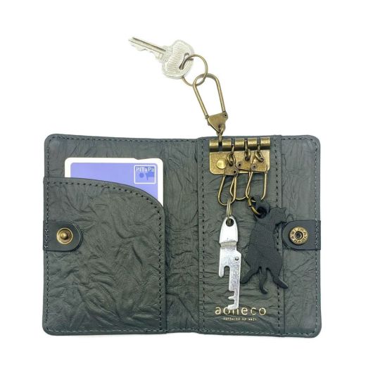 やわらかく手になじむ革を使用し、ひとつひとつ職人が丁寧に仕立てています。ポケットのカタチでさりげなくネコ要素をプラス。可愛くなりすぎない大人なネコアイテムです。鍵は4箇所つけることができます。ホックがついているので、鞄の中でも広がりません。外側と内側にポケットがひとつずつ交通系のカードを入れたりと使い勝手の良い仕様になっています。