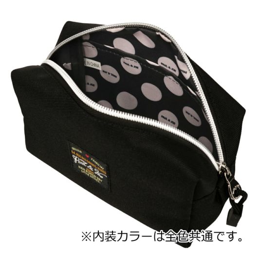 シンプルで使いやすいデザインのポーチが登場。軽量なポリエステル素材を使用。裏地はロゴ入りのドット柄。キュートな3匹の猫のアクリルキーホルダーは取り外し可能なのでお好きな場所に付けていただけます。