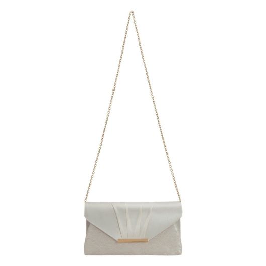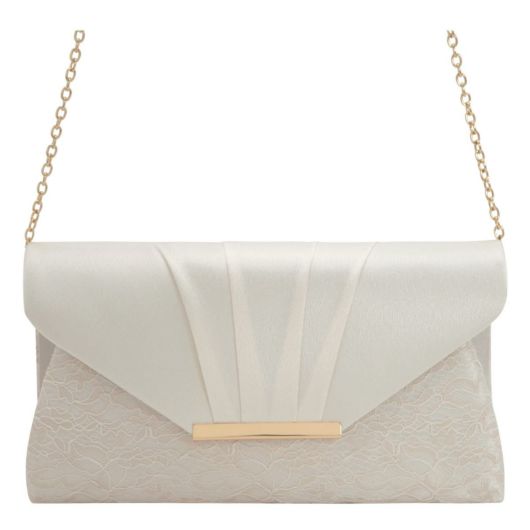 本体部分にレース生地、フラップ部分にサテンを用いたコンビネーションが特徴的なデザインのパーティーバッグです。クラッチバッグとして持っていただけ、さらには長短2種類のチェーンストラップが付いており肩掛けワンショルダー、斜め掛けと2通りの持ち方も楽しんでいただけます。