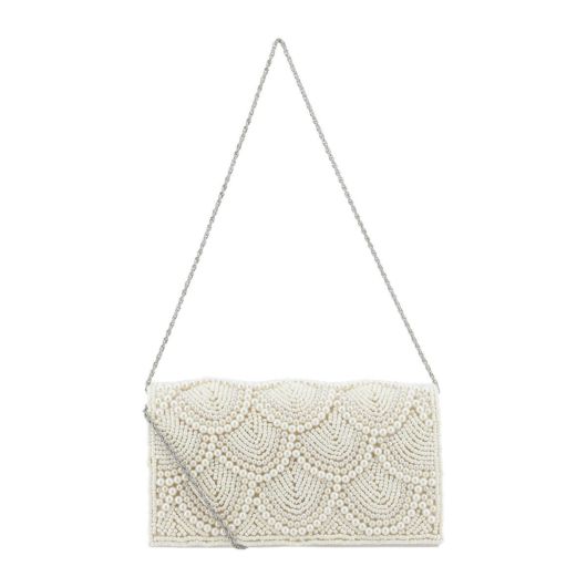 パールをたっぷりとあしらった華やかなうろこモチーフのミニクラッチ。