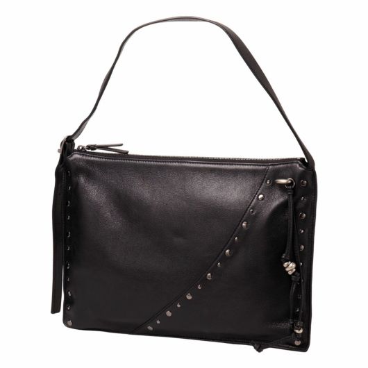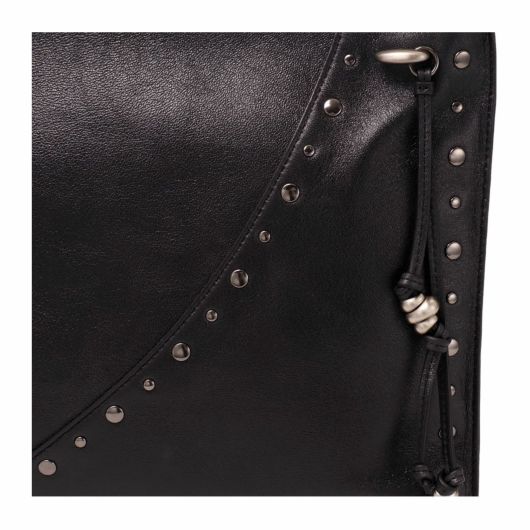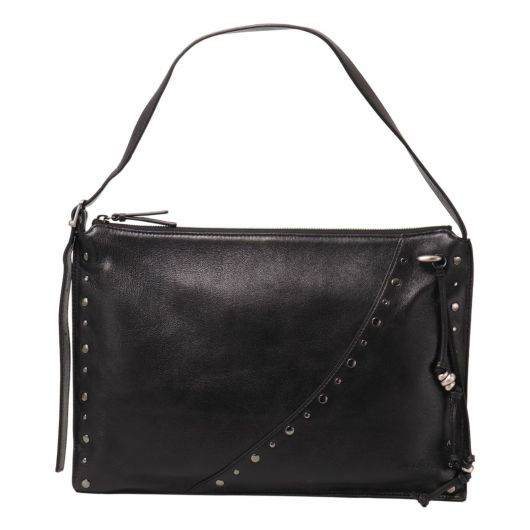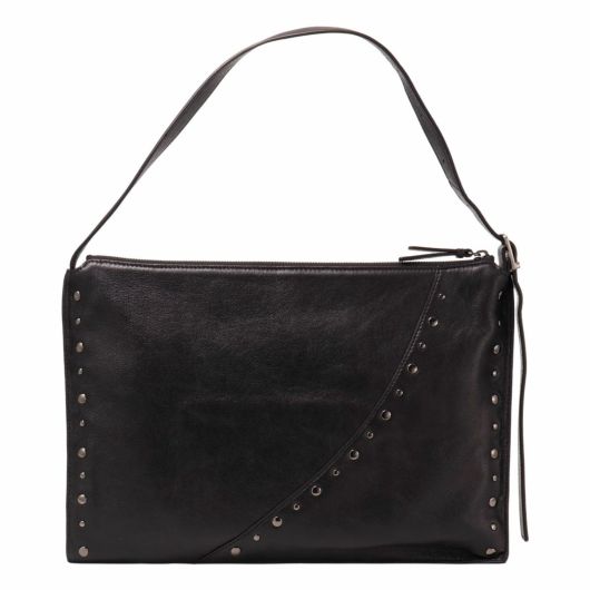 マチのないフラットなデザインが特徴。持ったときにバッグの中央が崩れる自然なニュアンスが魅力です。シンプルなスタイルにアクセントを添えるのは、ドーナツリング&ストラップとスタッズ。入れ口はジップ仕様で持ち物を安全に保管できるのが特徴です。