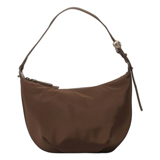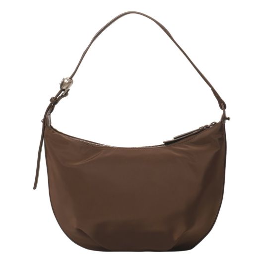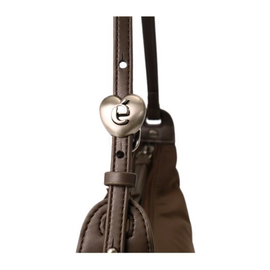 ハートのストッパー飾りがポイントのナイロン製ホーボーバッグ。シンプルなフォルムで、背負ったときに自然に折りたためるチャーミングなフォルムが魅力となってます。ストラップはストッパーとドローストリングのディテールで調節可能です。